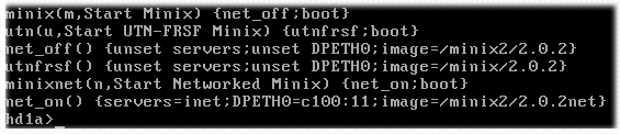 The next step is to configure RARP, to indicate the IP address of our Minix. Open the file /etc/ethers and put the MAC address of the emulated network card (information we obtained from the QEMU console), a tab, and the machine name (for example “minix”). More info with “man ethers”.