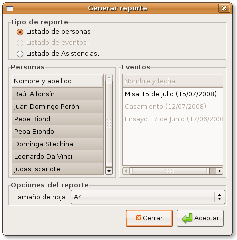 Los reportes que se pueden realizar son de personas y asistencias (aquí y aquí tienen ejemplos). Éstos se producen en formato PDF. Lamentablemente no hay una forma de imprimir los reportes directamente, por lo que puede ser complicado para usuarios inexpertos.