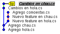 La rama de la izquierda corresponde a default, y la de la derecha a myproject-1.0. Para moverme entre los distintos branches de un repositorio, utilizo el comando “hg update nombreBranch”. Si después de eso realizo más commits, obviamente, pertenecerán al branch al que me he movido.