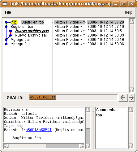 $ hg log changeset: 1:7c0e8fbd1fb1 user: Milton Pividori <mimail@proveedor.com> date: Sun Oct 12 13:52:18 2008 -0300 summary: Agrego chau.cs changeset: 0:936587b0804a user: Milton Pividori <mimail@proveedor.com> date: Sun Oct 12 13:52:05 2008 -0300 summary: Agrego hola.cs