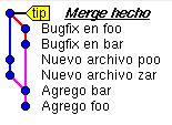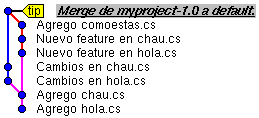 $ hg update default 2 files updated, 0 files merged, 1 files removed, 0 files unresolved $ hg merge myproject-1.0 merging chau.cs merging hola.cs 1 files updated, 2 files merged, 0 files removed, 0 files unresolved (branch merge, don't forget to commit) $ hg ci -m "Merge de myproject-1.0 a default"