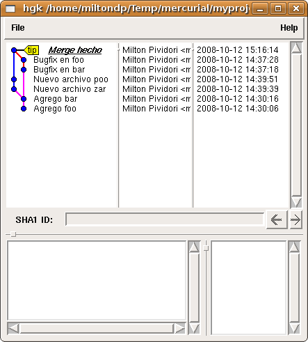Notar que Mercurial me avisa que han quedado varios heads: un head es un changeset sin hijos. Con el comando “hg view” puedo ver el panorama actual del repositorio:
