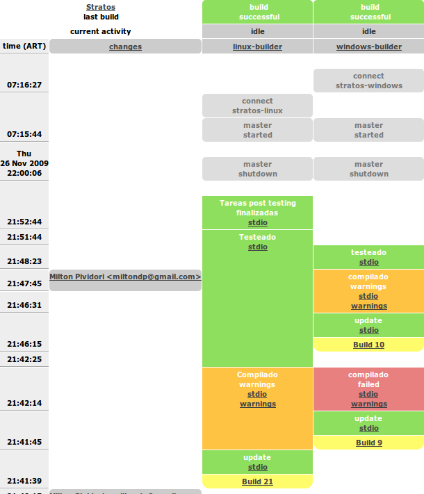 No se olviden de reiniciar el servicio de Buildbot, y de borrar los archivos .pyc de Python (por lo visto a veces funciona aunque no lo borremos). Ahora el ciclo funciona como uno espera: